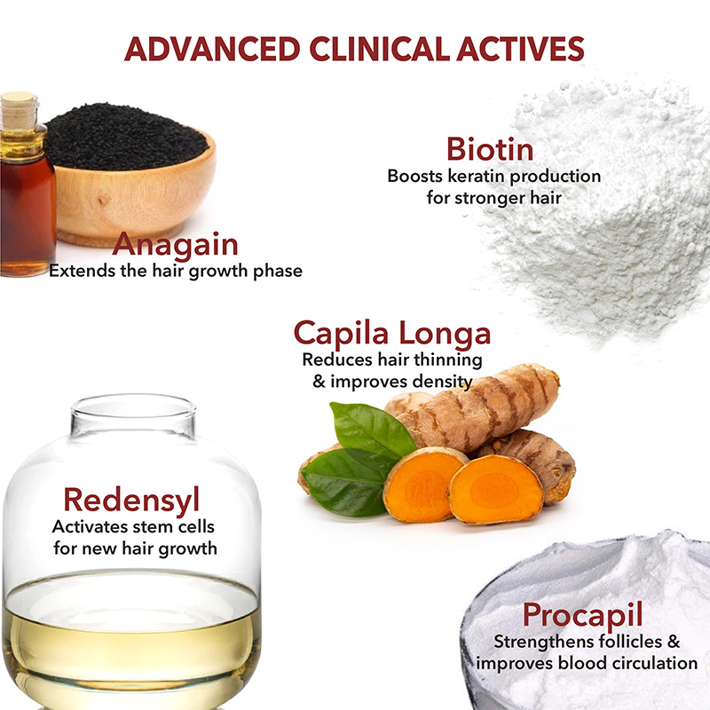 Redensyl, Procail, Anagain, Biotin, Capilia Longa, Sesame Oil, Arnica, Brahmi, Triphala Extract, Petals of Marigold, Roots of Karondya, Phytoestrogens (Soybean Oil-Glycine Max Seeds Oil), Culinary Flower Extract, Tella (Sudhi) Saugah, Akash Bel Ark, Lal Chirmi (Red Guava Seed), Trigonella Foenum Graecum (Methi Seeds Distillate), Saw Palmetto Extract, D-Panthenol, and Perfume.