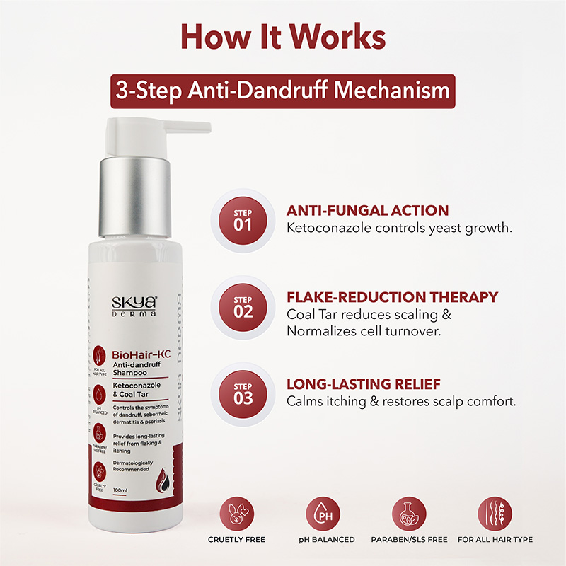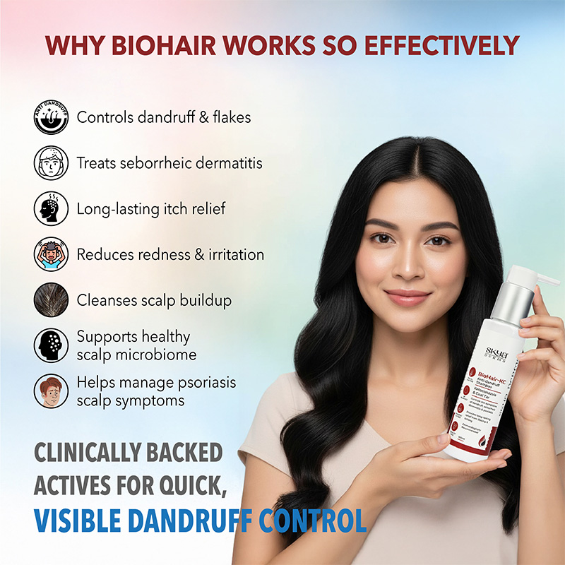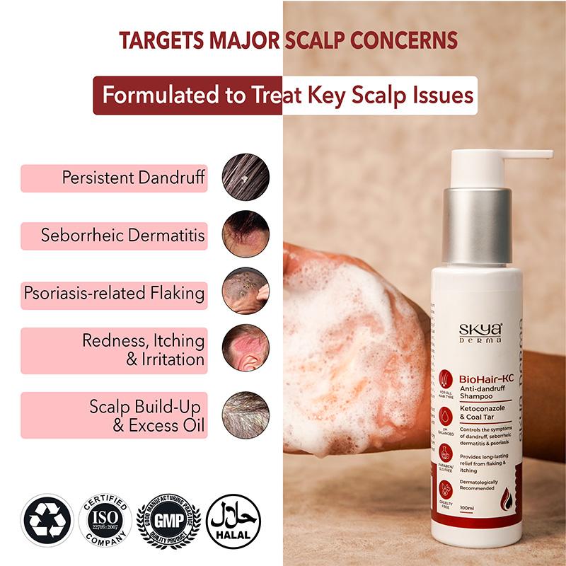 BioHair-KC -Anti-dandruff shampoo is formulated with ketoconazole and coal tar that are effective and help control persistent dandruff, reduce scalp inflammation, and provide long-lasting relied from itching and flaking.