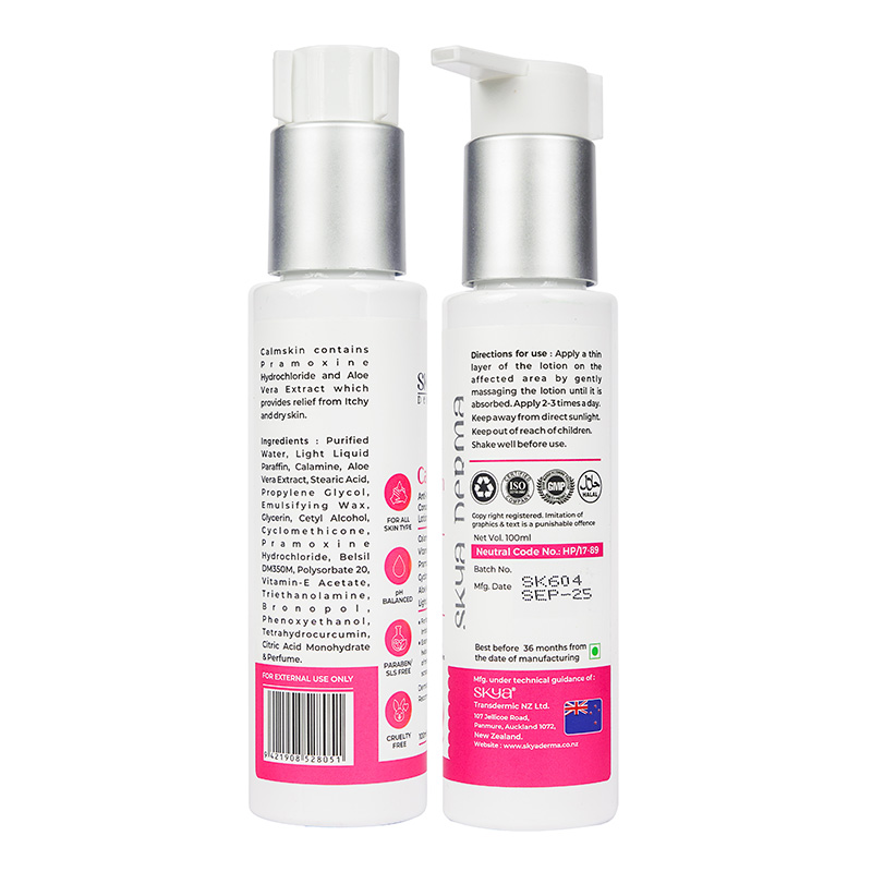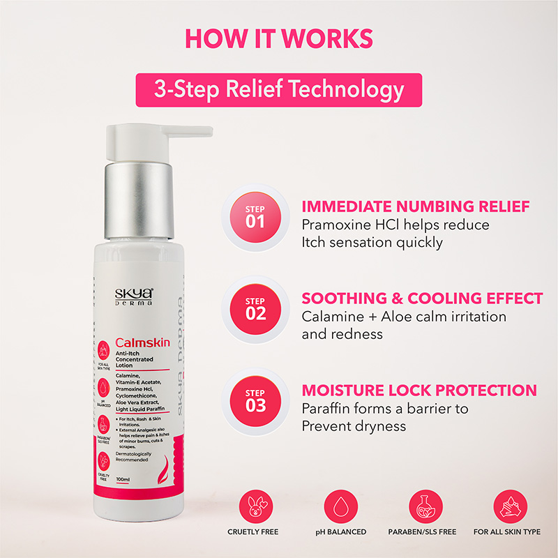 Calmskin Anti-Itch concentrated lotion is enriched with calamine, vitamin-E acetate, pramoxine HCl, cyclomethicone, aloe vera extract and light liquid paraffin. All these active ingredients can help relieve itchiness, rash discomfort, and minor skin irritations while calming sensitive skin. This product is considered best for the sensitive skin and provides quick relief from the pain and itch or minor burns. All the qualities of this product make it an ideal choice for irritated, itchy, or reactive skin. This product is dermatologically recommended for offering gentle and effective comfort.