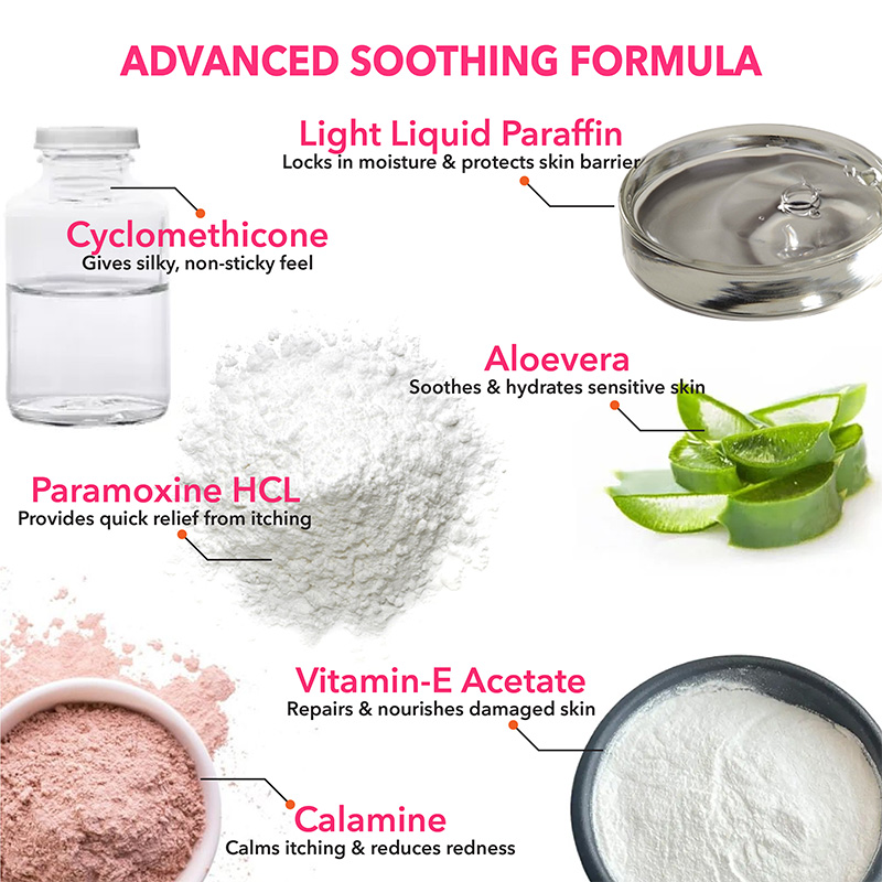 - Formulated with calamine, vitamin-E acetate, pramoxine HCl, cyclomethicone, aloe vera extract and light liquid paraffin