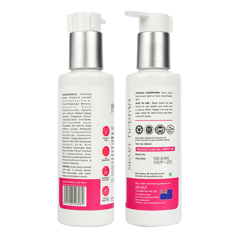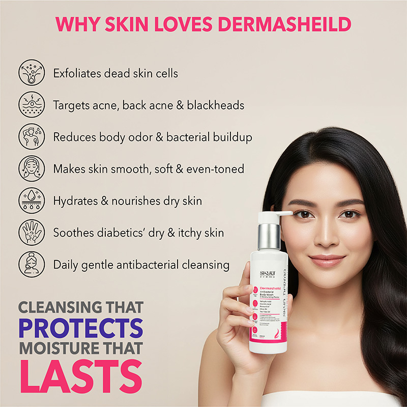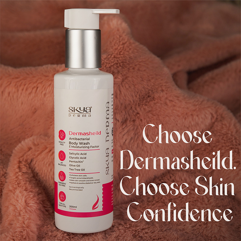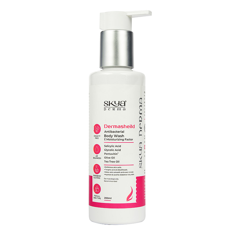 Dermasheild- Antibacterial Body Wash C moisturizing factor is formulated to cleanse, exfoliate, and hydrate the skin. It can help maintain the natural moisture balance of the skin. This product is especially designed to target acne, blackheads, and rough texture. It is an ideal choice for every skin type as it leaves the skin smooth and even-toned.