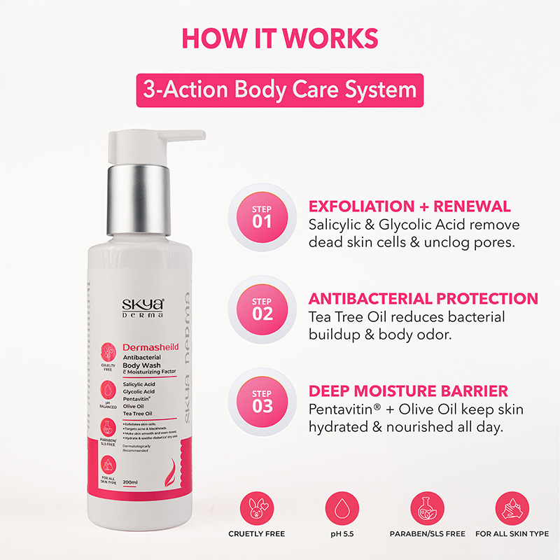 Dermasheild – Antibacterial Body Wash c Moisturizing Factor contains essential ingredients such as salicylic acid, glycolic acid, Pentavitin®, olive oil, and tea tree oil that can deeply cleanse the skin while helping to exfoliate dead skin cells and target acne & blackheads. This is an ideal choice for every skin type and recommended for those who can soothe irritation and support healthier looking skin.