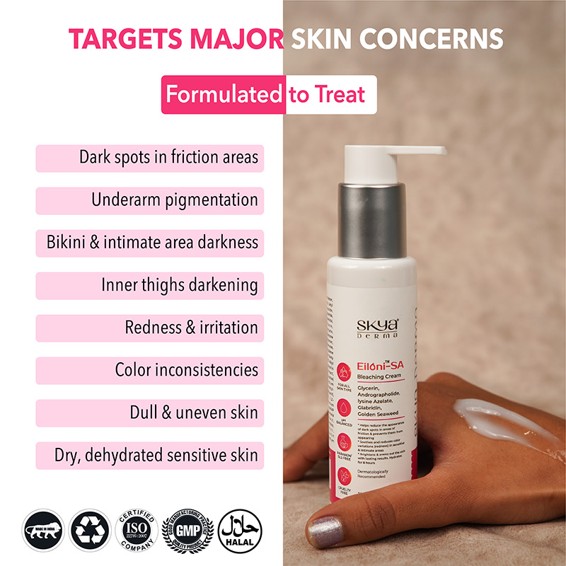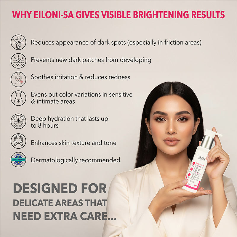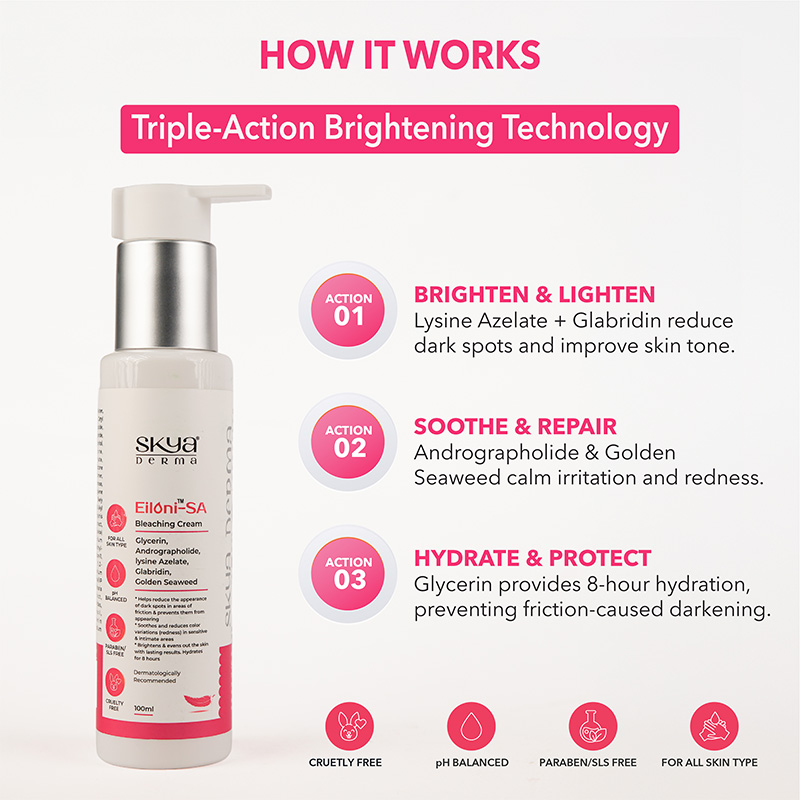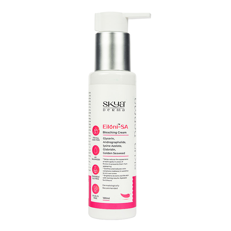 Eiloni- SA Bleaching cream is formulated with Glycerin, Andrographolide, Lysine Azelate, Glabridin, and Golden Seaweed that can help reduce the dark spots in areas of friction and prevent new discoloration from forming. It can be helpful in soothing redness, minimizing color variations in the sensitive and intimate areas and brightening the skin by offering long-lasting hydration for up to 8 hours.