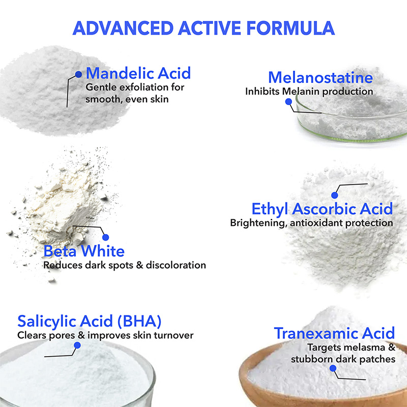 Tranexamic Acid, Ethyl Ascorbic Acid, Melanostatine⢠5 PS, Beta White, Tyrostat, Mandelic Acid, Salicylic Acid