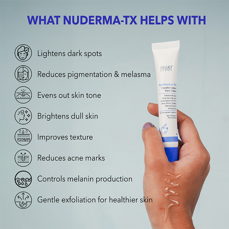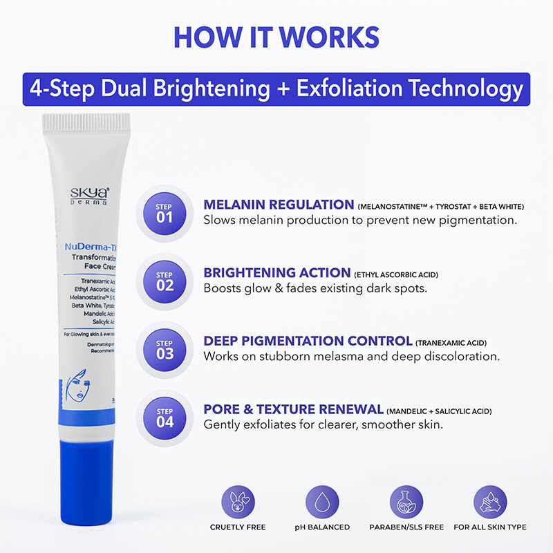 NuDerma-TX Transformation face cream is an advanced brightening and transformation face cream, formulated with tranexamic acid, ethyl ascorbic acid, Melanostatine⢠5 PS, Beta White, tyrostat, mandelic acid and salicylic acid that are ideal for reducing dark spots and enhance overall radiance. Ideal for dull, uneven, and pigmentation-prone skin. This product doesnāt cause irritation and support a visibly brighter and smoother complexion.