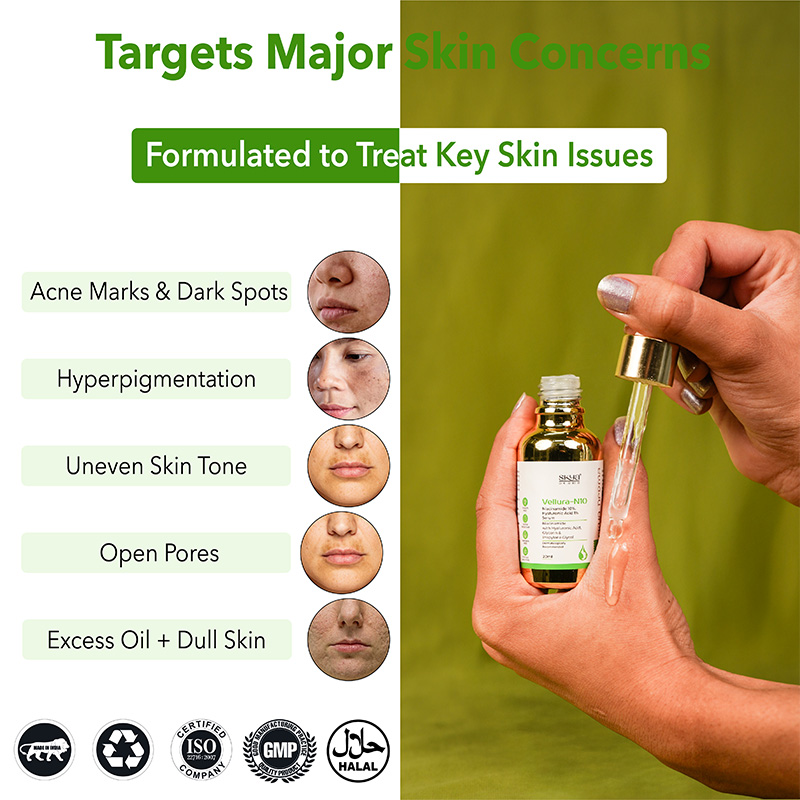 Vellura-N10 Niacinamide 10% + Hyaluronic Acid 1% Serum is a balancing daily serum that can help reduce acne marks, fade dark spots, and treat hyperpigmentation and keep the skin hydrated and plump. It is enriched with glycerin and propylene glycol. Helps strengthens the skin barrier and minimize the appearance of pores without stripping moisture.