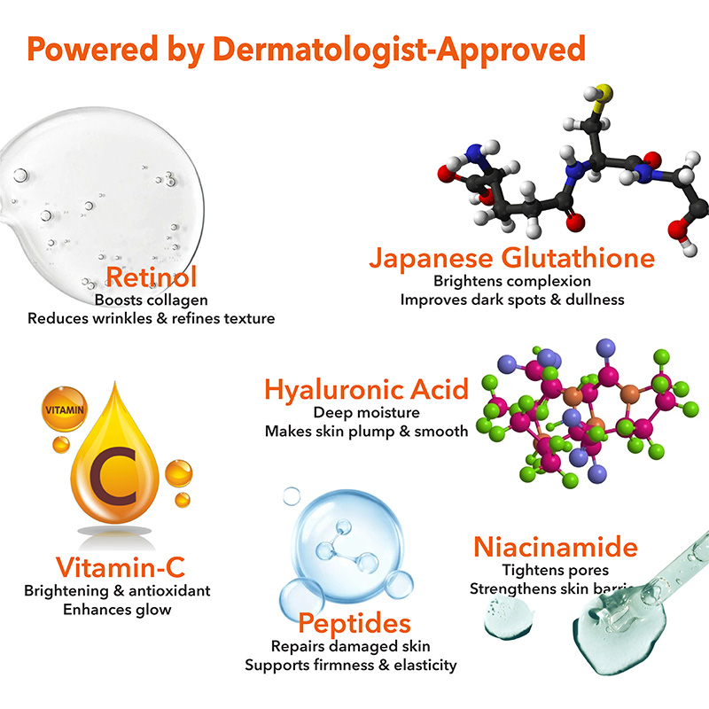 Japanese Glutathione, Retinol, Hyaluronic Acid, Vitamin-C, Niacinamide, Peptide & Natural Extracts